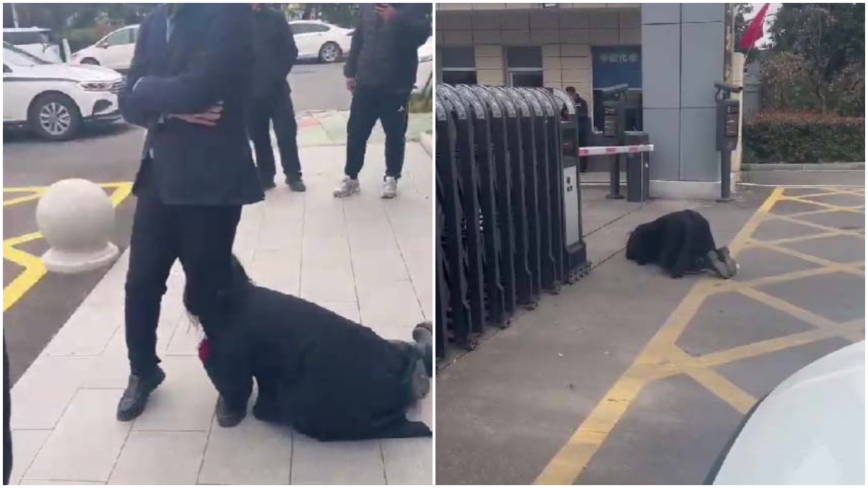 (「お願い、約束したお金をください、家族は今日食べる物もないんです」と国営企業の門前で担当者の足に抱きついて給料の支払いを求める労働者の女性、2024年11月19日、江蘇省連雲港市灌雲県)