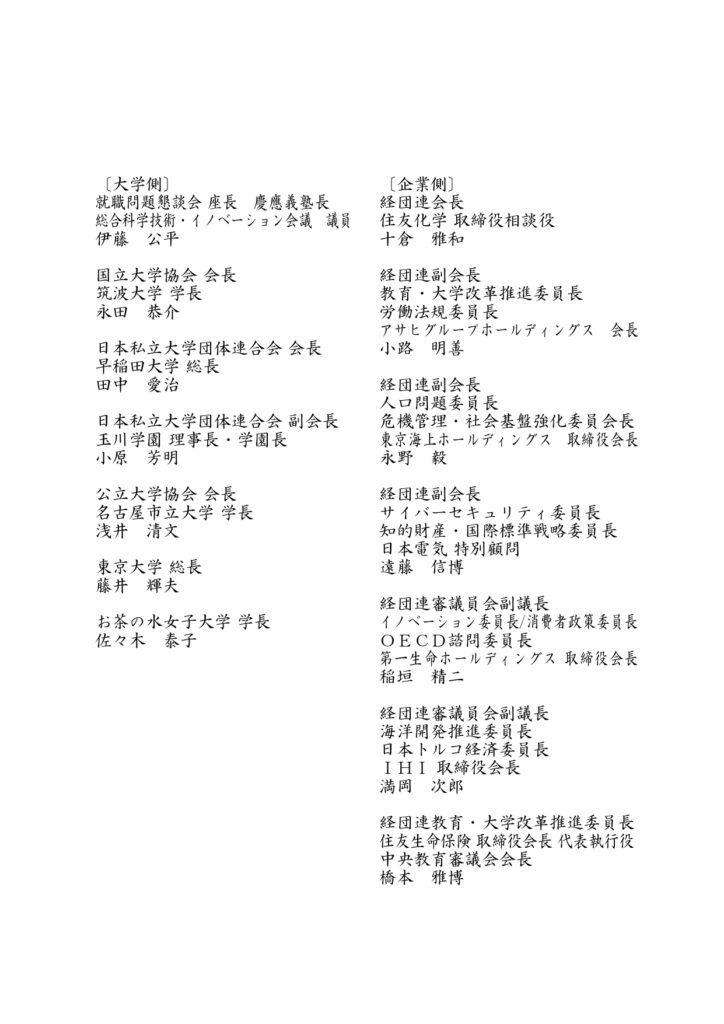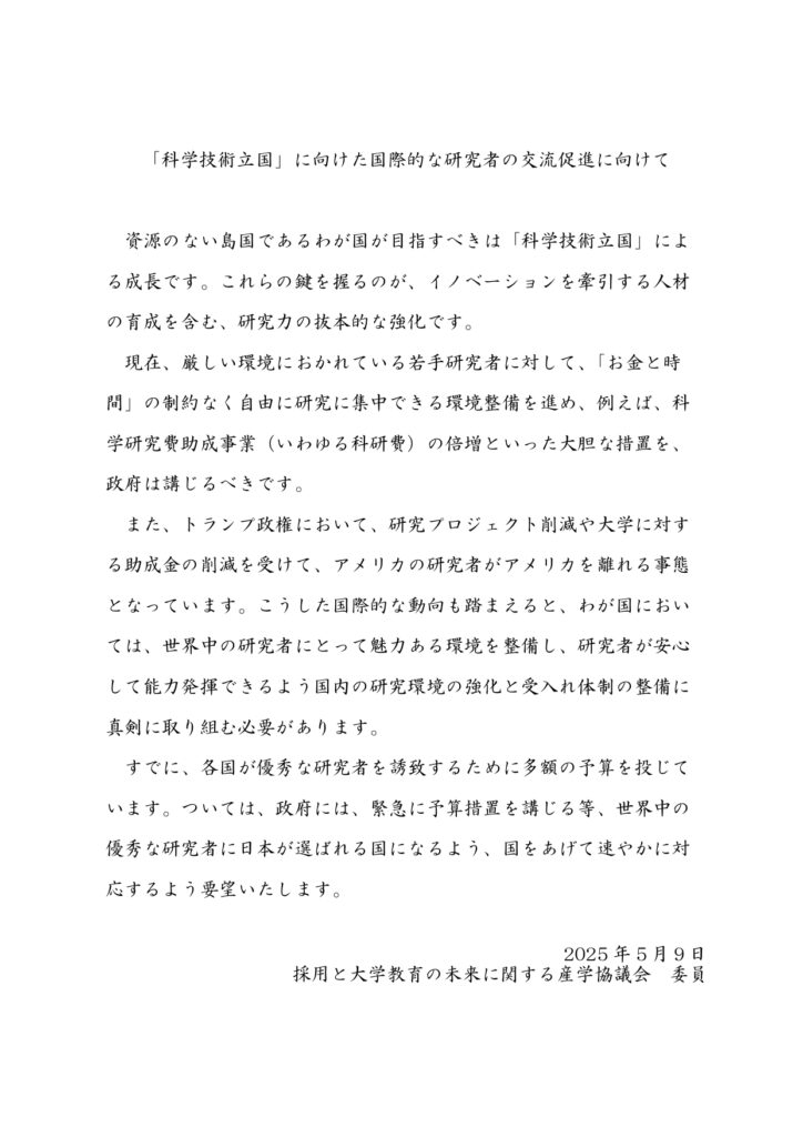 2025年5月9日、経団連と国公私立大学の代表者で構成される「採用と大学教育の未来に関する産学協議会」は、「科学技術立国に向けた国際的な研究者の交流促進に向けて」と題した要望書を政府に提出し、政府に対して大胆な政策転換を求めた。