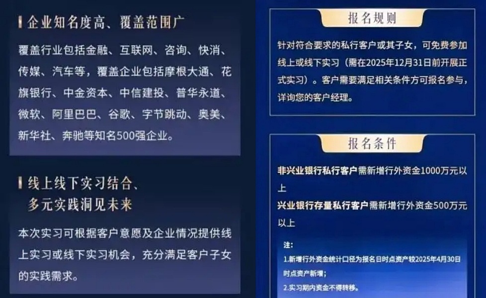 同行の「2025精英インターン計画」によれば、新規で1千万元(約2億円)以上の預金、あるいは既存顧客で500万元(約1億円)以上を追加で預け入れた顧客の子どもに対し、海外の名門企業でのインターンシップが「優先的に」提供されるという。対象となる企業にはGoogle、マイクロソフト、JPモルガン、中金資本、バイトダンスなどの名が挙がっている。なお、インターン期間中の資金移動は禁止されている。