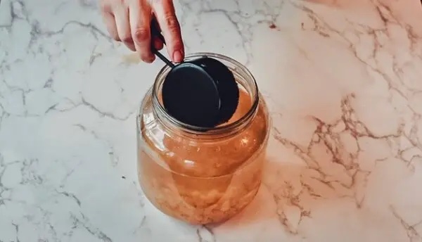 - 3~5日間、または泡立ちと炭酸感が出るまで発酵させます。室内が約24°C以上の場合、通常3~4日かかります。寒い家では5日~1週間以上かかることがありますが、蓋を開けて泡立ち具合を確認する必要があります。泡立ってきたら上部から泡が溢れ出します。