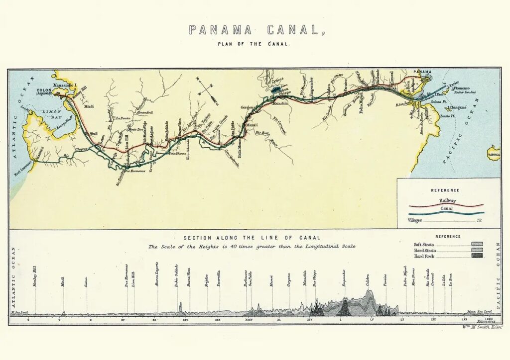 当初は、スエズ運河のような平坦で直線的な構造を想定していましたが、地形の高低差により「閘門」の導入が必要となりました。これは巨大な水の部屋を使って、水位を調整し、最大約26メートルの高低差を越えて船を上下させる仕組みです。
