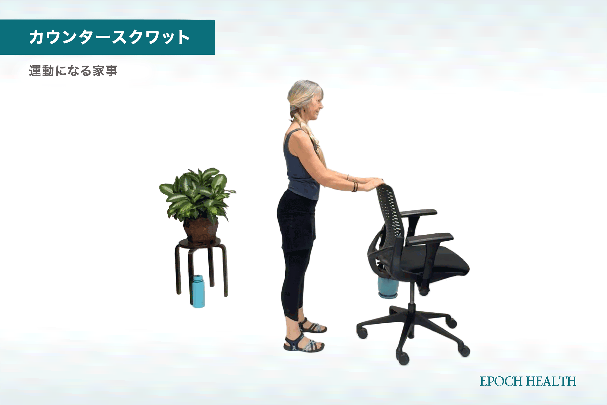 コツ:椅子や安定したものをそばに置いておいても大丈夫です。無理のない姿勢で行いましょう。