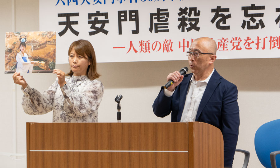 天安門事件で亡命した中国人元学生の組織「民主中国陣線」日本支部の王戴氏は、ロナルド・レーガン元米大統領の「この壁を壊しなさい」という名言になぞらえ、「反人類的な中国共産党という壁を打ち壊そう」と呼びかけた。