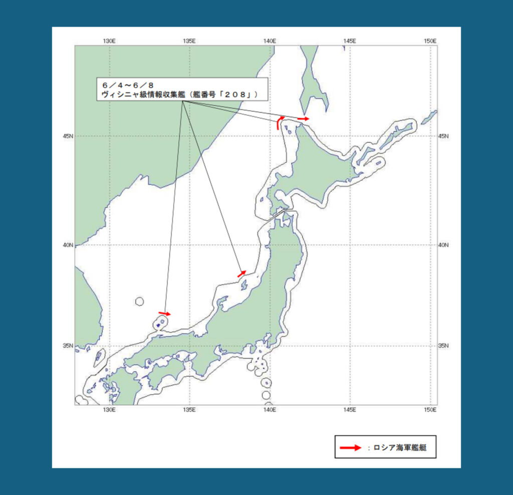 ヴィシニャ級情報収集艦は、電子情報の収集や通信傍受などを主な任務とするロシア海軍の艦艇であり、近年も日本周辺での活動が複数回確認されている。今回の航行経路は、日本海から宗谷海峡を経てオホーツク海方面へ抜けるルートであり、各地の接続水域(領海の外側12海里以内の海域)を通過したが、日本の領海への侵入は確認されていない。