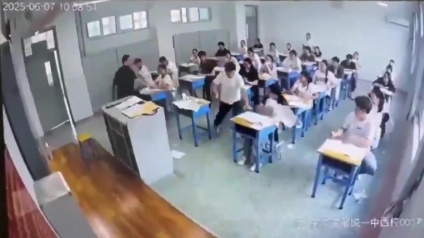 (2025年6月7日、山東省鄒城市の「高考」会場で、受験生が突如錯乱し、自身と他の受験生の答案用紙を破り捨てる騒動が発生)