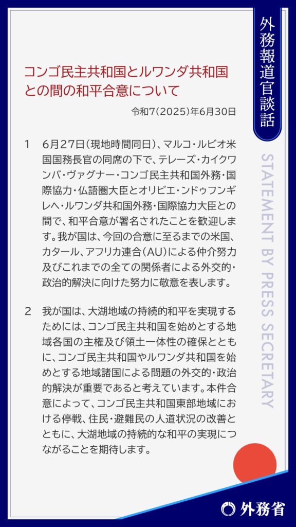 外務省ウェブサイトによると、日本政府は今回の合意に至るまでの米国、カタール、アフリカ連合の仲介努力と、関係者による外交的・政治的解決に向けた取り組みに敬意を表している。さらに、日本は大湖地域の持続的な平和の実現には、コンゴ民主共和国をはじめとする各国の主権や領土の一体性が守られること、そして地域の国々が外交的・政治的手段によって問題を解決することが重要であると強調した。