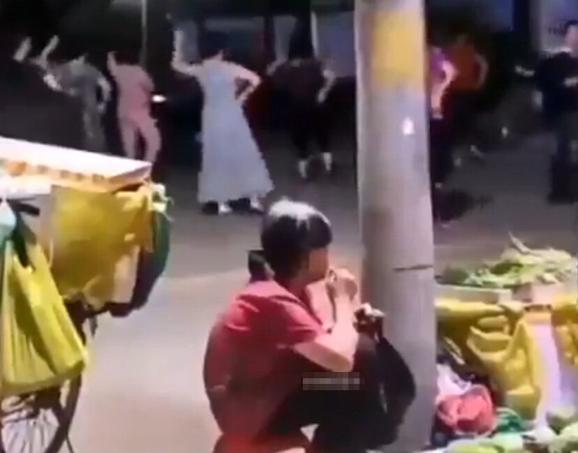 写真には、昼夜を問わず娯楽で公園や広場で思い思いに踊る「広場舞(スクエアダンス)」のご婦人たちの姿と野菜売りのおばあさんが映っている。