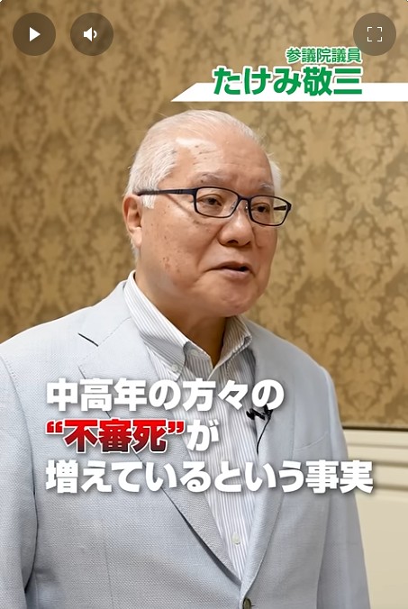 令和7年7月8日、厚生労働省で福岡資麿大臣による定例記者会見が行われた。この会見で、記者から「50歳前後の不審死が急増している」との武見敬三前厚生労働大臣のYouTubeでの発言について、厚生労働省として事実を把握しているかどうか質問があった。