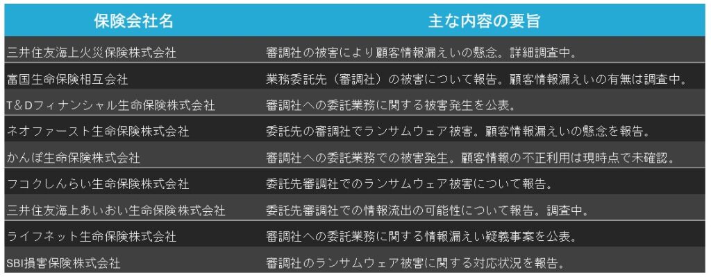 審調社のランサムウェア被害に関連し、同社と業務委託関係にある複数の保険会社が、2025年7月11日付で公式リリースを発表していることを確認した。主な内容は、審調社のサーバーが不正アクセスを受けたことによる顧客情報漏えいの懸念や、現時点での調査状況、顧客・関係者への謝罪などである。