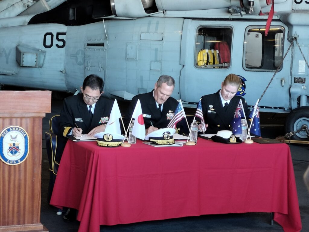 海上自衛隊の星直也装備計画部長は7月11日、オーストラリア東部ブリスベンに停泊中の米海軍艦船上で、米国・オーストラリア両海軍の責任者とともに、日米豪3カ国海軍によるロジスティクス協力の強化に関する文書に署名した。今回の協定では、艦船の弾薬補給や海上給油、修理、部品供給など、各国の海軍が互いに支援し合う体制を一層強化することが盛り込まれている。共同通信などが報じた。