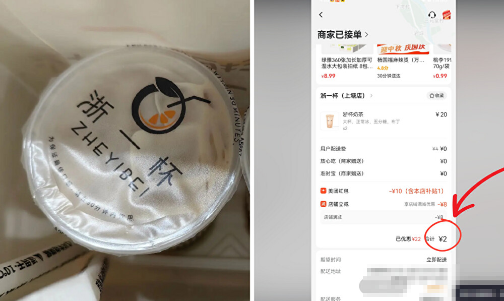 クーポン使用によりわずか2元(約40円)」で買える配達コーヒー。(SNS投稿映像よりスクリーンショット)