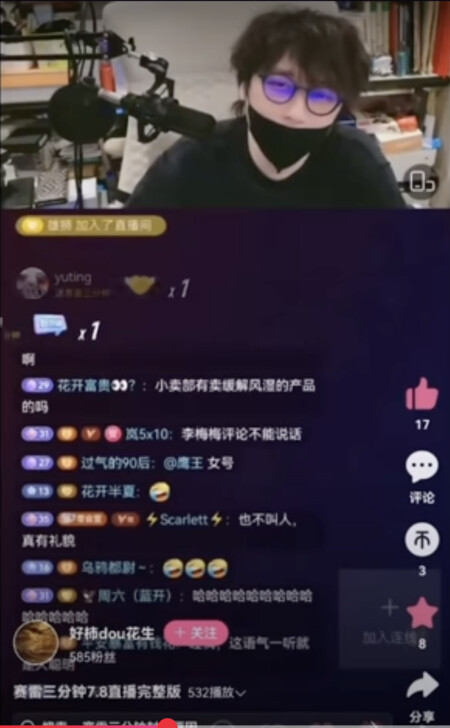 配信中、黒いマスクをつけた張琪沅(ちょう・きえん)さんは「あなたは習が独裁者だと思わないのか?」と問いかけた。(映像より)