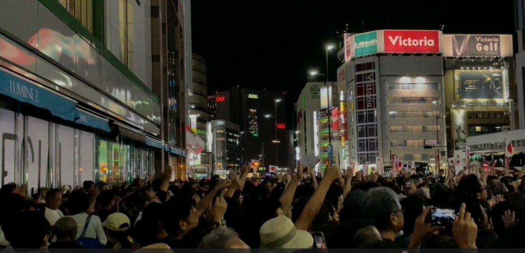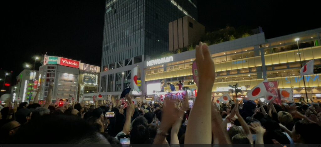この日19時、新宿駅南口には多くの支援者や市民が集まり、最後の訴えに耳を傾けていた。新宿駅周辺は人で埋め尽くされるほどの盛況ぶりで、現場は通行できないほど一時混雑状態となった。