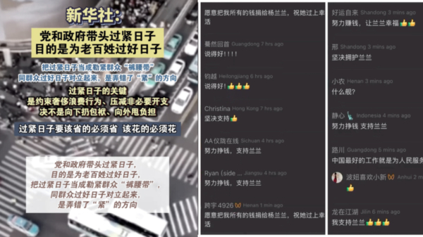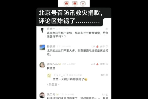 中国SNSでも楊の名前はトレンド入りし、「中共の特権階級の出身ではないか」との憶測が広がった。やがて8月8日には、北京の水害義援金呼びかけや新華社の倹約生活論評のコメント欄が「楊蘭蘭が寄付すれば足りる」などの皮肉で埋め尽くされ、同様の書き込みが殺到するまでに至った。