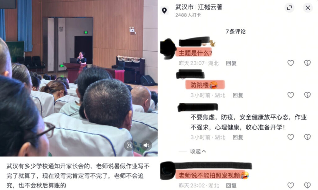 この夏、湖北省武漢市では小中学生の自殺が相次いだため、当局は学校に対し、保護者対象に「自殺防止」を目的とする緊急会議の開催を命じた。ある学校は「飛び降り防止」を掲げて心理的ケアを行うと説明したが、別の学校では言葉を濁し、「教師は宿題を強制しない」「保護者も宿題のことで叱らないで」と繰り返し、子供に落ち着いて新学期を迎えるよう促した。