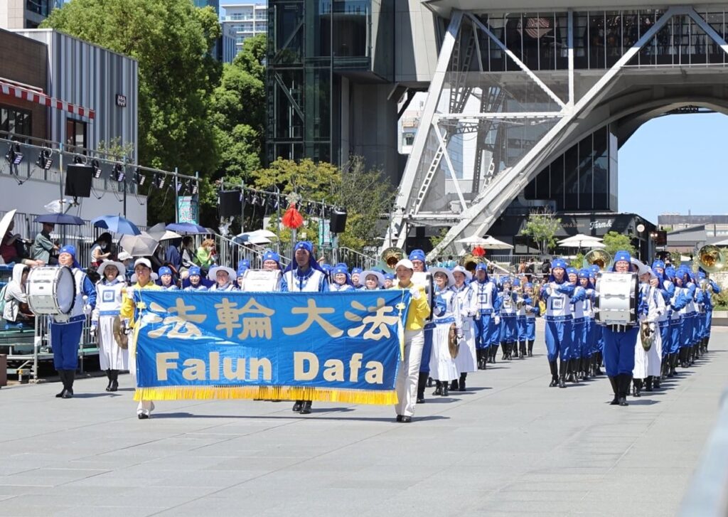 「天国楽団」は、日本と台湾の法輪大法学習者100名以上で構成され、中国の伝統衣装をまとい、ど真ん中祭りの三日間にわたり、5回のパレードと5回のステージ、合計10回のパレードやステージで迫力満点の音楽を披露した(大紀元)