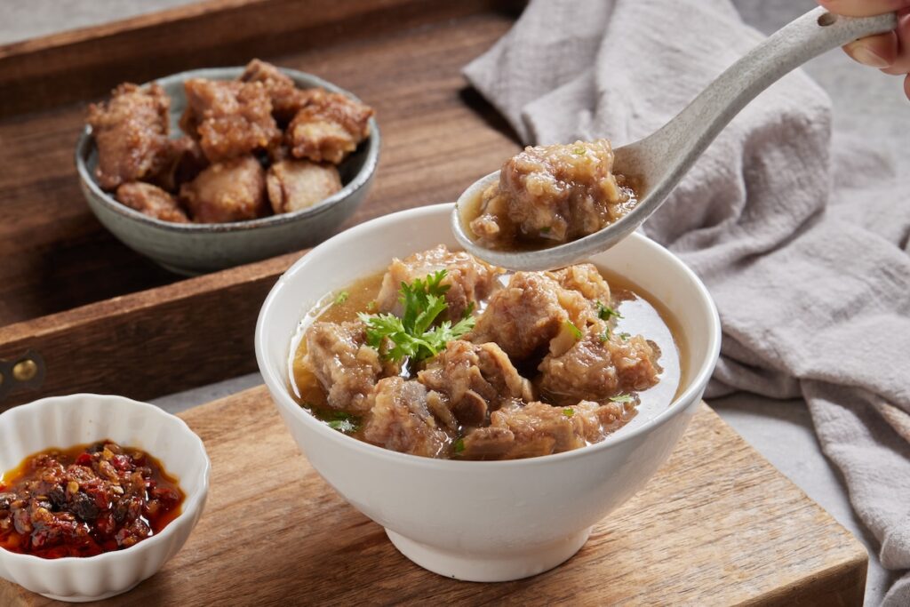 台湾の夜市や家庭で親しまれてきた伝統スープ「排骨酥湯」。最大の特徴は、骨付き豚肉を一度香ばしく揚げてから煮込む独特の製法にあります。揚げたことで旨味を閉じ込め、煮込むことで柔らかくほろほろに。濃厚な豚骨スープに、雲林産にんにくと西螺醤油のコクが溶け込み、仕上げに加えるにんにくチップが香りと甘みを引き立てます。
