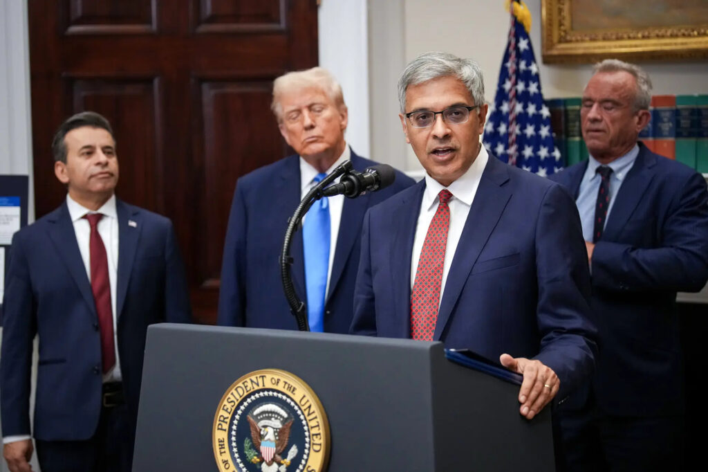 国立衛生研究所のジェイ・バッタチャリア所長は、食品医薬品局長官のマーティ・マカリー博士、ドナルド・トランプ大統領、ロバート・F・ケネディ・ジュニア保健福祉長官とともに、2025年9月22日にホワイトハウスで行われた発表で発言した。Andrew Harnik/Getty Images