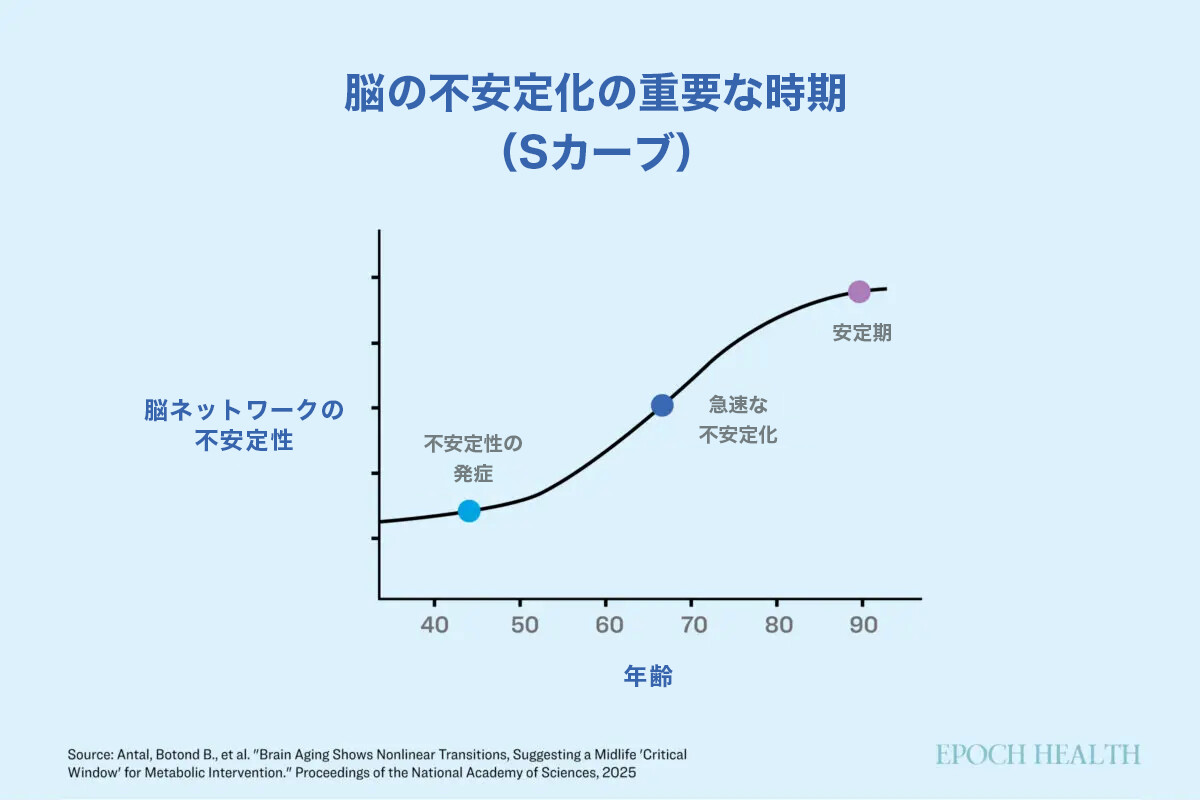 脳の老化は予測可能な軌跡をたどります。徐々に直線的に衰退するのではなく、「S字型」のカーブで変化し、介入が最も効果的な特定の時期があることを示唆しています。