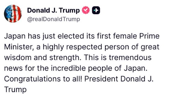 ベッセント財務長官も、X(旧Twitter)で「トランプ大統領に同意する。素晴らしいニュースだ」と語り、高市氏の新総裁選出に祝意を示した。