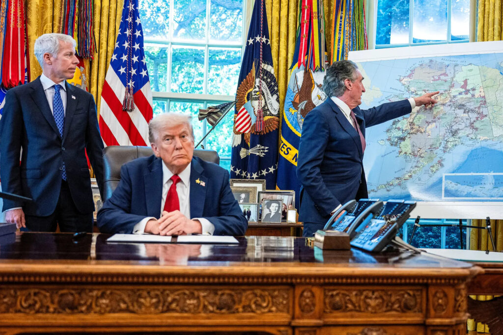 ドナルド・トランプ大統領は、2025年10月6日に大統領執務室で、アラスカ州のアンブラー・ロード鉱山プロジェクトを認可する大統領令に署名した後、ダグ・バーガム内務長官(右)がアラスカの地図を指さし、クリス・ライト・エネルギー長官(左)が見守る中、その話を聞いている。Jim Watson/AFP via Getty Images