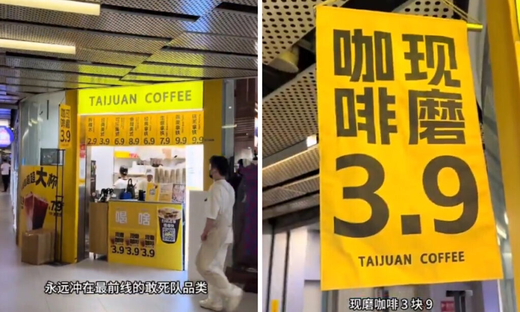 上海や北京の高級商業エリアでも注目を集めているのが、新興ブランド「タイジュアンコーヒー(太巻咖啡)」だ。店名の「太巻」は、若者の間で使われる「内巻(過剰競争)」という言葉をもじったもので、激しい値下げ競争を皮肉りつつ、自らその「戦場」に飛び込む姿勢を象徴している。店では2.9〜3.9元(約60〜80円)の激安コーヒーが並び、価格破壊の象徴として人気を集めている。
