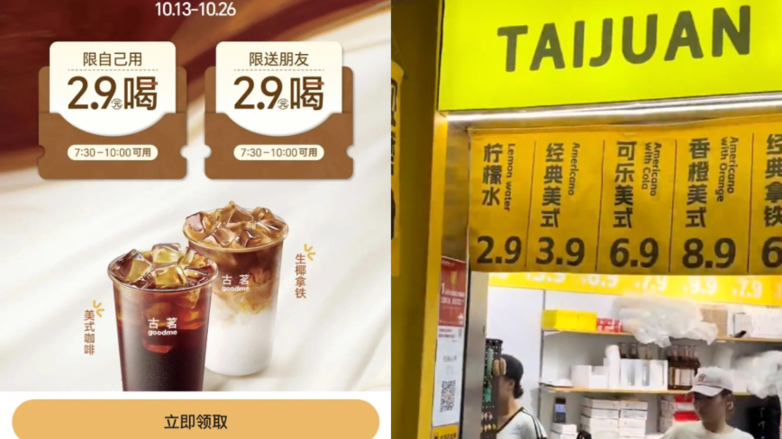 浙江省を拠点とする新興ブランド「グーミン(古茗)」は、10月13~26日まで朝限定で1杯「2.9元(約60円)コーヒー」を販売開始。9月にも45日間のキャンペーンを実施し、1杯4.9元(約100円)のアメリカンコーヒーを提供して話題を呼んだ。