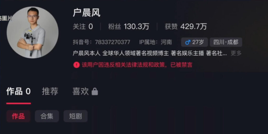 封殺された戸晨風のSNSアカウント(スクリーンショット)