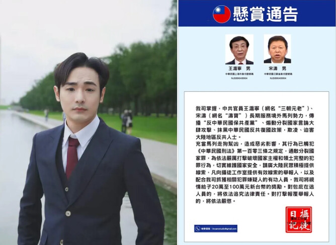 左が台湾の著名反共系インフルエンサー・八炯。右は八炯がSNSで公開した、中共の高官2名を逆に「指名手配」する懸賞通告(スクリーンショット/合成)