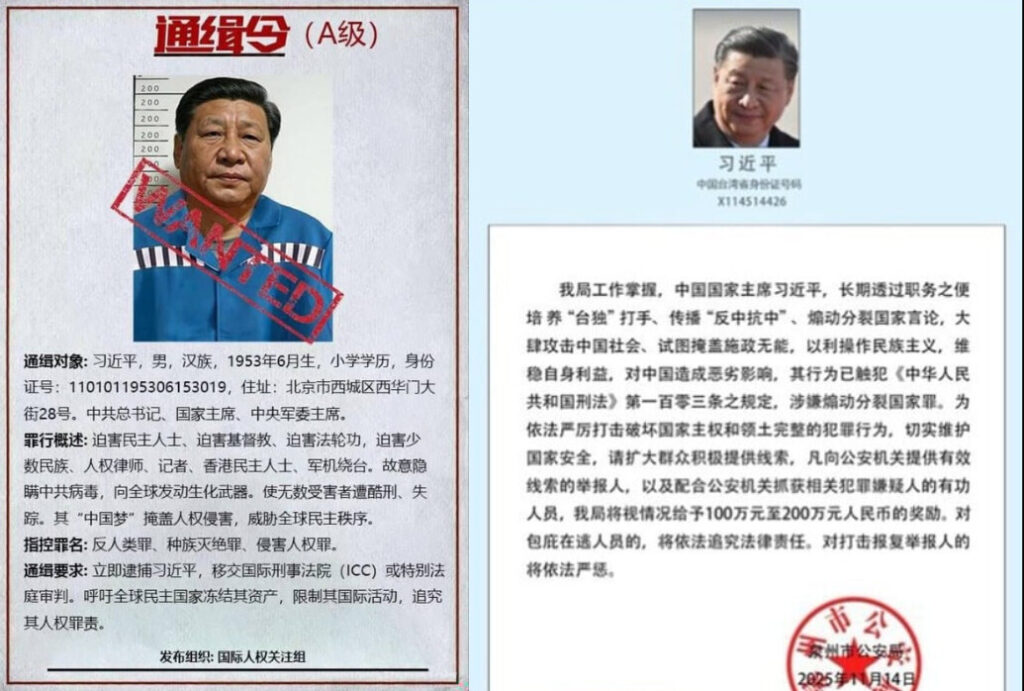 この手配騒ぎがネット民の遊び心に火をつけ、ついには中共党首・習近平を賞金首にした本物そっくりの手配書まで拡散される事態に発展した。習の罪状は「政治の失敗をごまかし、民族主義を操作し、自らの利益を守るため中国に害を与えた」という手厳しい内容で、懸賞金は日本円で約2~4千万円。台湾の身分証番号らしき数字や「泉州市(福建省)公安局」の署名まで添えられ、悪ふざけとは思えないほどの本格仕様だった。