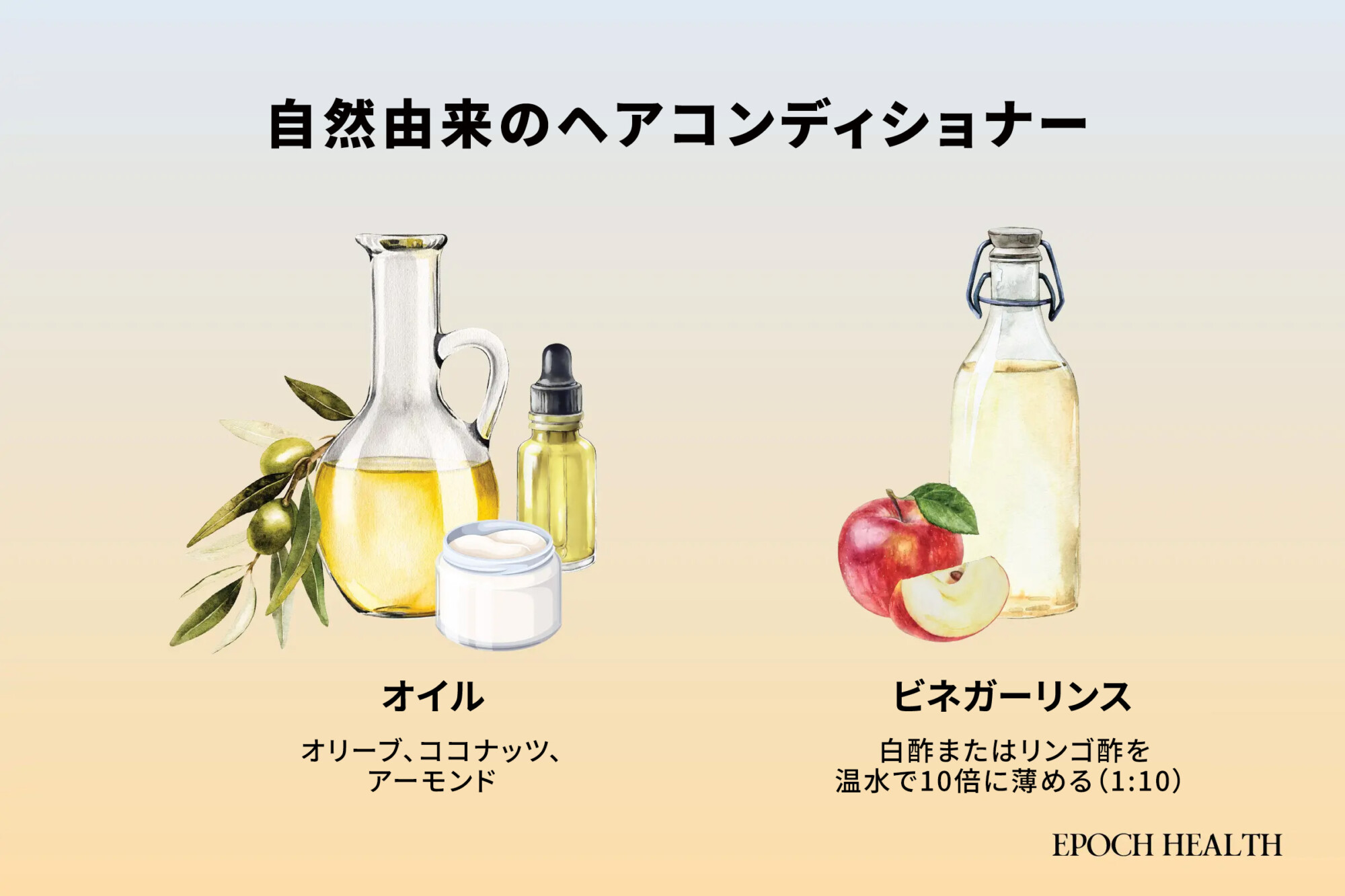 合成コンディショナーを避けたい人には、ロクサー博士はオリーブオイル、ココナッツオイル、アーモンドオイルなどの天然オイルを提案しており、これらが「優れた自然代替品」だと述べました。天然オイルはタンパク質を含み、毛幹に浸透し残り、失われたタンパク質を補充します。