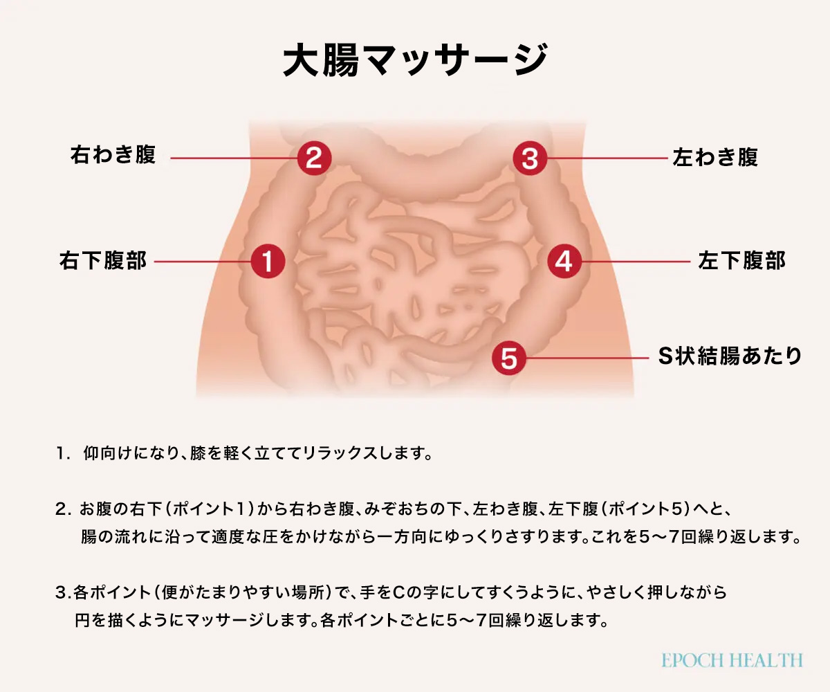理学療法士のジリアン・ミラー氏はエポックタイムズに対し、「一時的または慢性的な便秘に悩み、手でマッサージを行える人であれば、誰でも腹部マッサージを試してみる価値があります」と語っています。初めてで不安を感じる人は、訓練を受けた専門家によるマッサージを少なくとも一度体験することが勧められます。