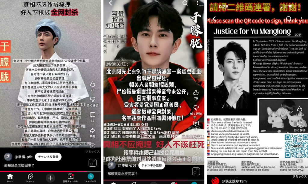 2025年9月11日、中国人俳優・于朦朧(ユ・メンロン/ユ・モンロン/アラン・ユー、37歳)が北京の高級住宅地で転落死したと報じられた。当局は「酒の後の不慮の事故」と説明し、数時間で「刑事事件ではない」と結論づけた。