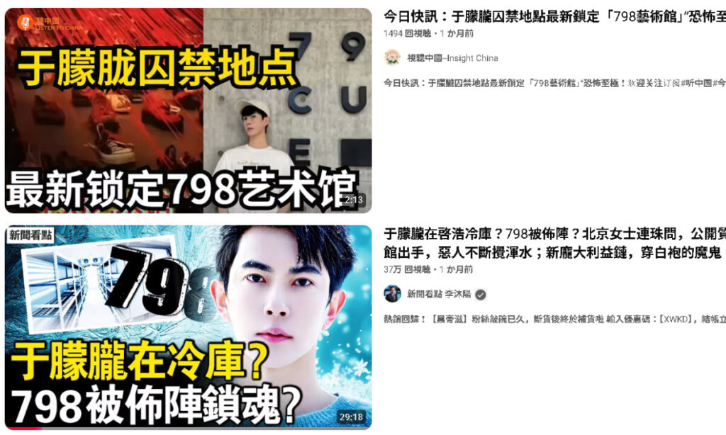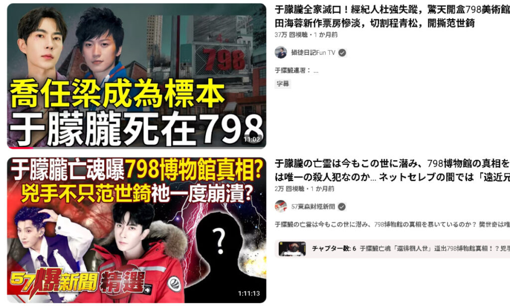 中国語圏YouTubeでは、台湾メディアや華人系セルフメディアが、霊媒が伝えたという「于朦朧の遺体は北京の芸術施設にある」とするメッセージをもとに番組化しており、北京・798芸術館との関連を追及する内容が拡散されている(スクリーンショット)