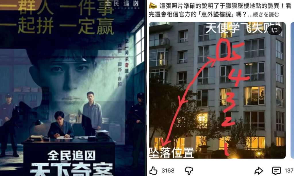 左はネットユーザーが作成したポスターで、「全民追凶(皆で真犯人を追う)」「一群人 一件事 一起拼 一定赢(力を合わせれば必ず勝てる)」と掲げ、于朦朧事件の真相究明を訴えている。右は于朦朧の墜落現場を自ら検証したネットユーザーが示した、落下位置と住宅の窓の「異常なずれ」を示す写真。このずれに加え、現場ではほかにも多くの不可解な点が確認され、これらをまとめた十数ページの市民調査報告が中国語圏で拡散。事件の闇への疑念はいっそう強まっている。(スクリーンショット)