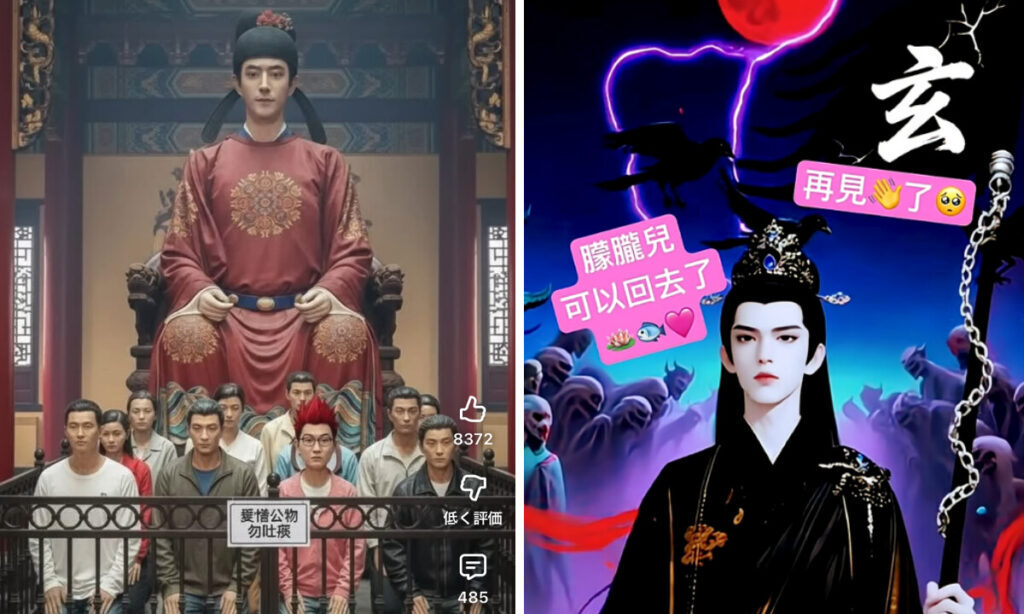 左は、于朦朧をイメージした人物が昔の裁判官の姿で玉座に座り、加害者とされる人物たちが跪く構図として投稿された画像。右は、同じイメージが「冥界から戻る」姿として描かれ、正義を願う市民の思いを象徴している(ネット投稿よりスクリーンショット)