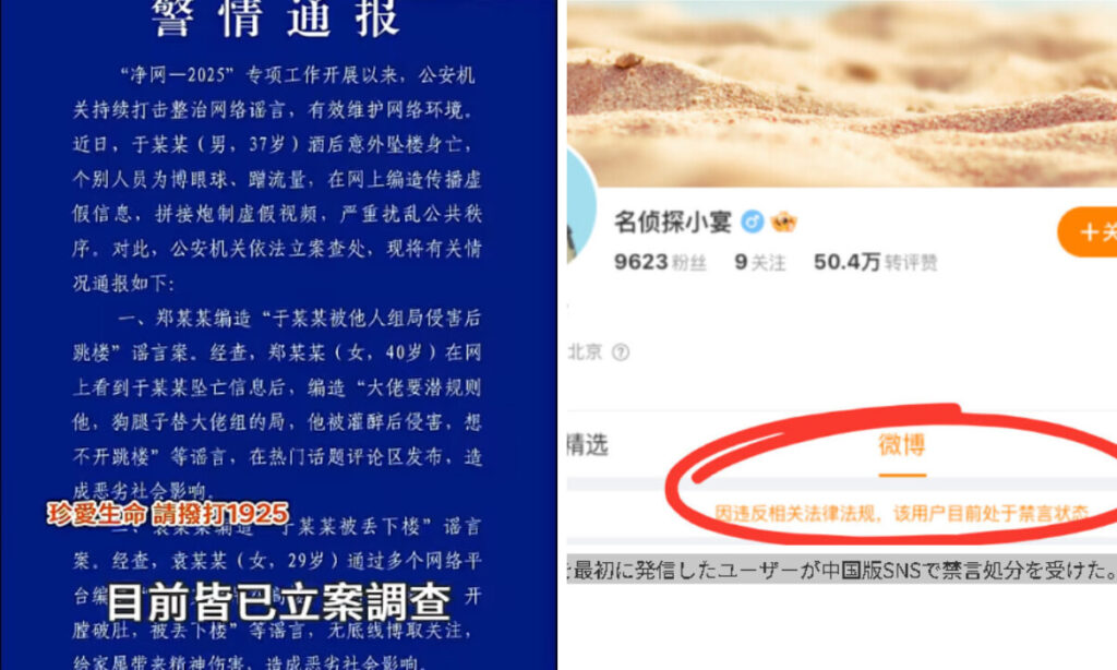 左は、事件の情報を伝えた複数の市民を「デマ拡散者」として拘束したと北京警察が発表した文書。右は、于朦朧事件を最初に発信したユーザーが中国版SNSで禁言処分を受けた画面。(スクリーンショット)