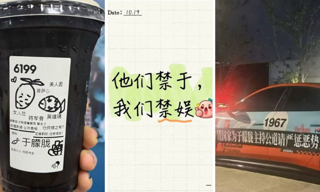 検閲下でも市民はさまざまな方法で于朦朧の名を世に残そうとしている。左はネット注文のドリンクに印刷される名前欄を彼の名に変更した例、右は車体に真相追及を呼びかける文字を貼る人、中央はネット上で広がる「禁于・禁娯」の決意と呼びかけ。(画像より)