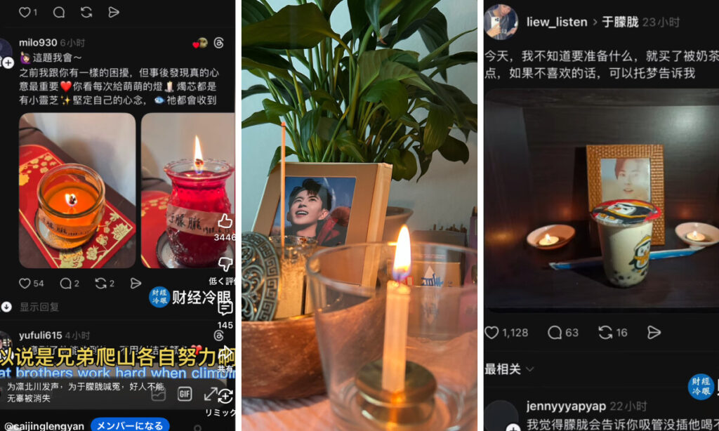 中国語圏では、于朦朧のために蝋燭を灯す投稿が広がっている。于朦朧が霊媒やEVPを通じて「点灯(蝋燭を灯してほしい)」と伝えたという話が共有され、多くの人が彼のために明かりをともしている。右は蝋燭とともに供えられた、彼が生前好んだタピオカミルクティー。(スクリーンショット)