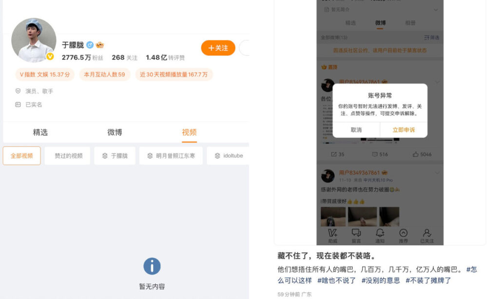 (左)は、于朦朧の公式ウェイボーに投稿されていた動画がすべて削除され、コメント欄も全面的に閉鎖された状態を示す画面。(右)は、ウェイボーアカウントに「規約違反で発言禁止」と表示され、投稿・コメント・フォロー・いいねが一切できない状態にされたユーザーの画面。(スクリーンショット)