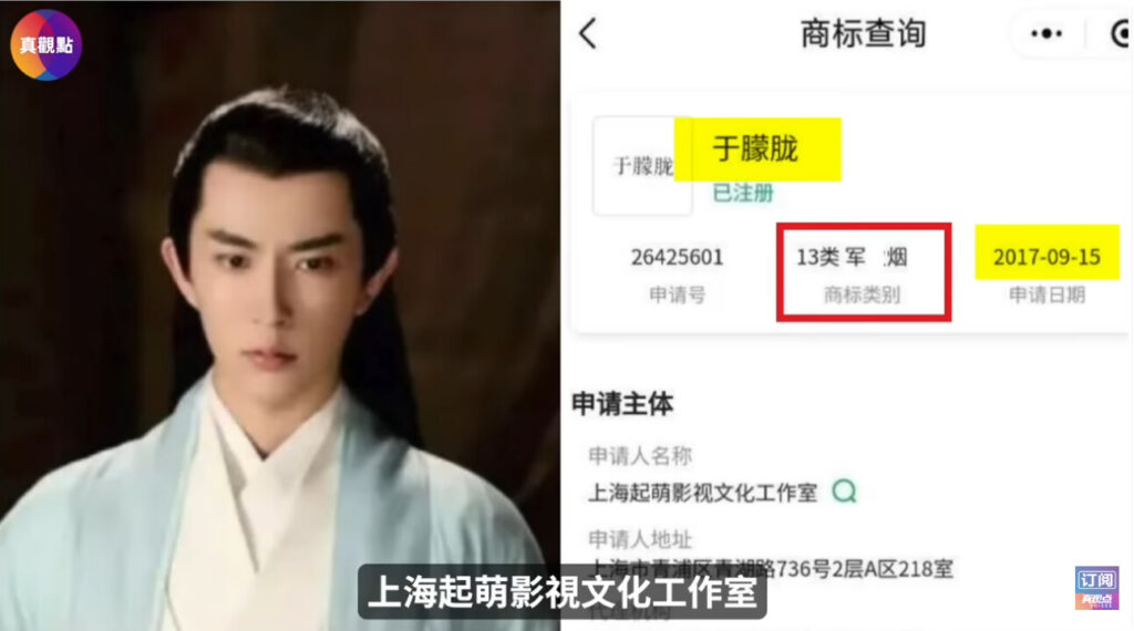 于朦朧名義では、商標の中にも13類「軍・煙」(軍需品区分)で登録されたものが存在することが確認されている。芸能とは無関係な分類で、市民の間では“何に使われていたのか”と疑問が強まっている。(ネットより)