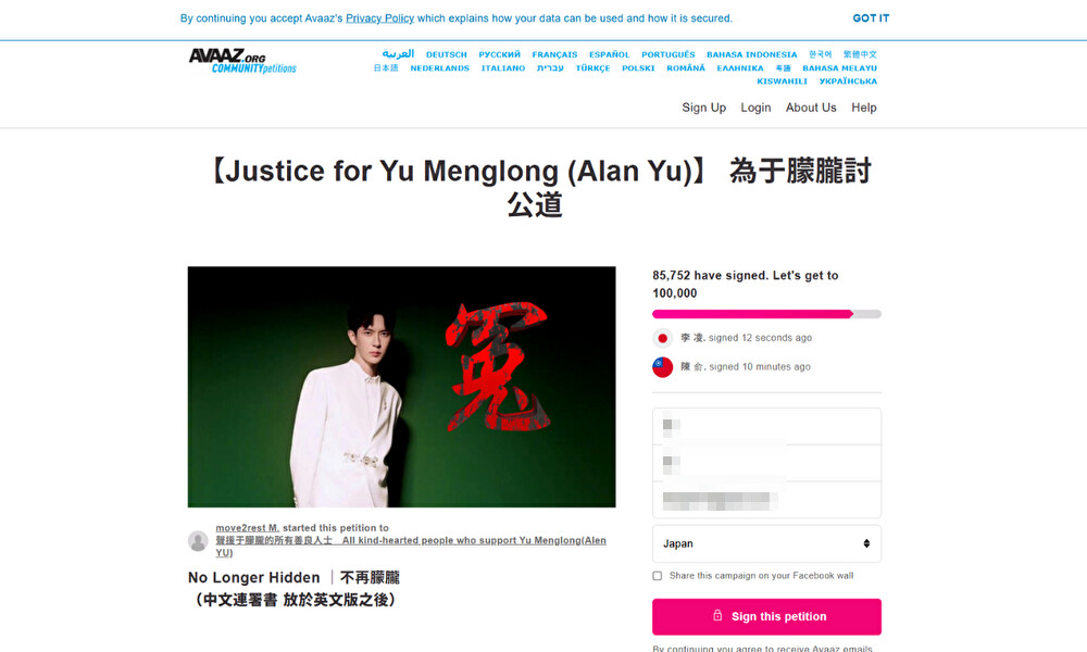 AVAAZの署名ページ。誰でも署名可能。(スクリーンショット)