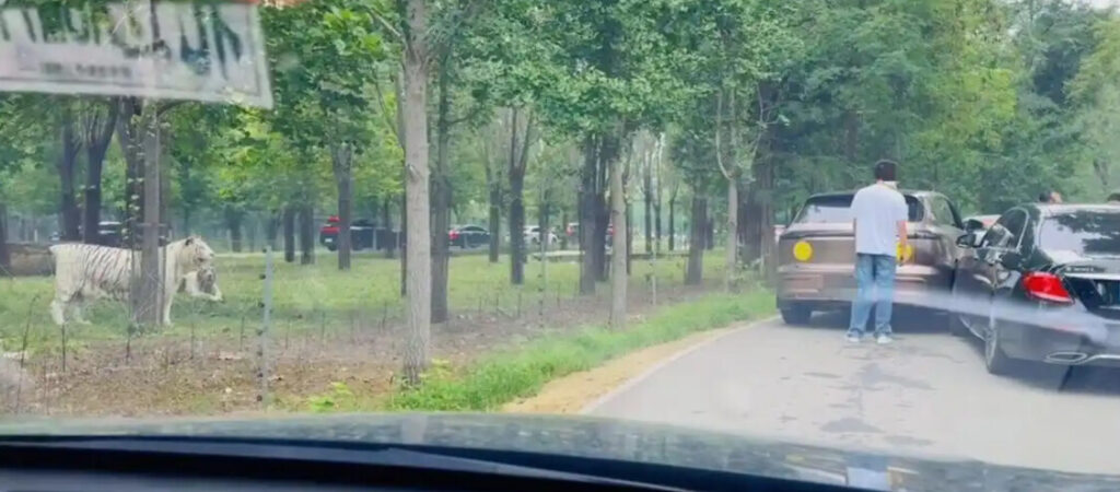 女性は自家用車で「猛獣ゾーン」に入ったところ、トラは興味津々で、女性の車をロックオンし、次の瞬間には本気の追跡モードに切り替わった。