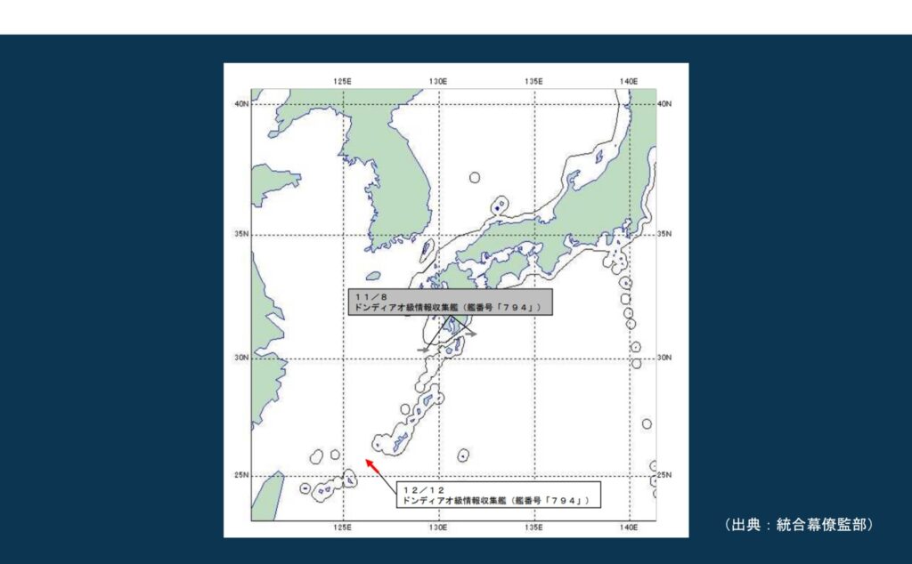 海上自衛隊は、12月12日(金)午前7時頃、宮古島(沖縄県)の北東約120kmの海域において、当該のドンディアオ級情報収集艦「794」を確認した。同艦艇はこの海域を北西に進んでおり、その後、沖縄本島と宮古島との間の海域をさらに北西に進み、東シナ海へ向けて航行した。