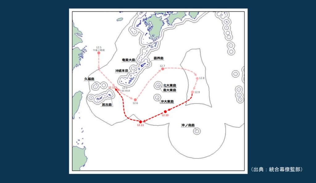 海上自衛隊は、9日以降も引き続き、「遼寧」を含む中共海軍艦艇を太平洋上で確認した。12月10日(水)には沖大東島の南東約210km、11日(木)には沖大東島の南西約390kmの海域において航行している状況を確認している。確認された艦艇には、空母「遼寧」のほか、ルーヤンⅢ級ミサイル駆逐艦2隻(117及び124)が含まれていた。