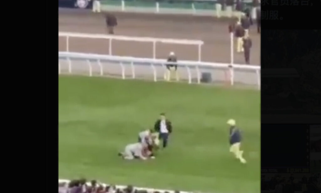 こうした中、12月14日午後、香港・沙田競馬場で開催されていたロンジン香港国際競走の最中に、1人の男が行動に出た。男は火災の調査を求める横断幕を手に、レース終盤のコース内へ立ち入った。