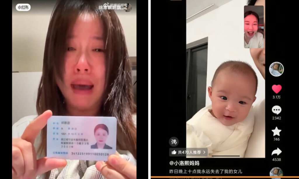 左:身分証を手に実名で告発する洛熙ちゃんの母親、鄧蓉蓉さん。右:生前の洛熙ちゃん(映像よりスクリーンショット)