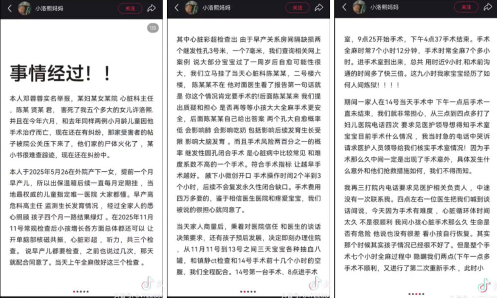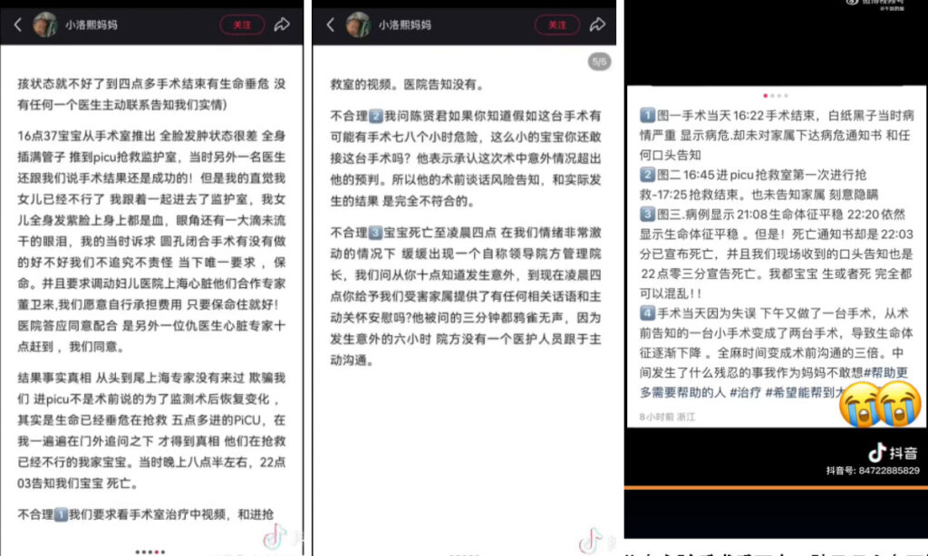 中国浙江省寧波市の病院で、生後5か月の乳児が心臓手術後に死亡。母親が手術の異常な経過や病院側の不誠実な対応を訴えた。同じ医師による過去の乳児死亡例も浮上