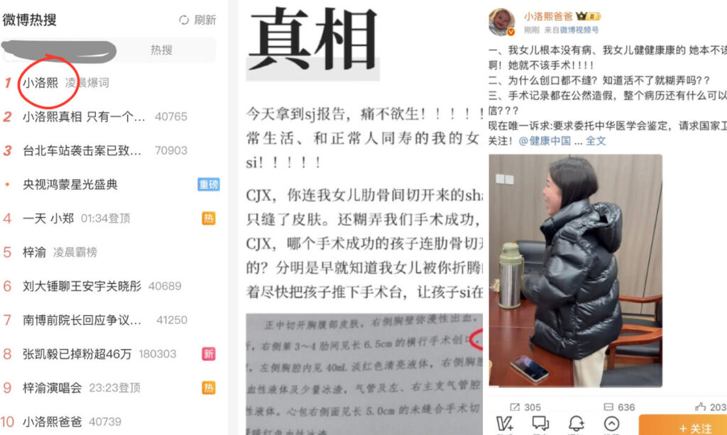 左:12月19日、「小洛熙」が中国SNS・微博(ウェイボー)のトレンド1位となった画面。中央と右:洛熙ちゃんの両親によるSNS投稿。(スクリーンショット)