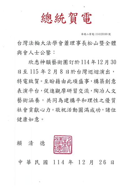 頼清徳総統の祝電では、神韻芸術団が中華民国114年(2025年)12月30日から115年(2026年)2月8日まで台湾で巡回公演を行うことを喜ばしく思うとし、「この芸術の祭典を通じて創造的な表現の場を築き、相互の見聞と交流を促進し、人文と芸術の素養を磨き、平和的かつ理性的な良質社会の構築に共に力を尽くしたい」と述べた。